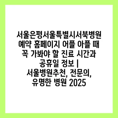 서울은평서울특별시서북병원 예약 홈페이지 어플 아플 때 꼭 가봐야 할 진료 시간과 공휴일 정보 | 서울병원추천, 전연락, 유명한 병원 2025 에 대해 자주 묻는 질문 TOP 5